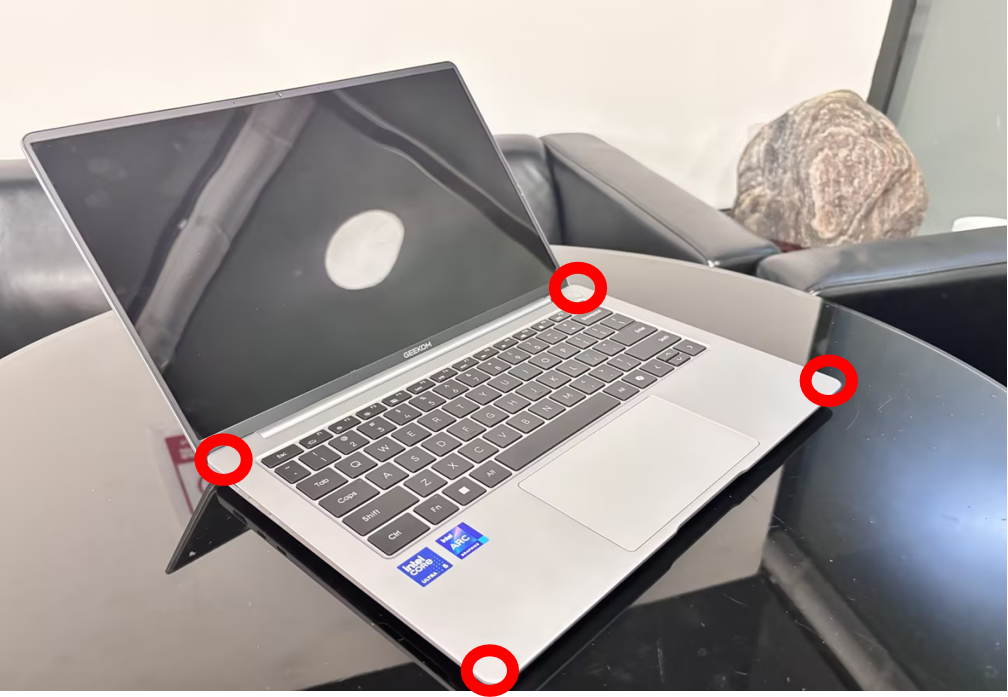 Legen Sie den Laptop zurück auf den Tisch und drücken Sie die vier gezeigten Punkte, um zu beobachten, ob die Maschine noch wackelt, wie in Abbildung 2 dargestellt.