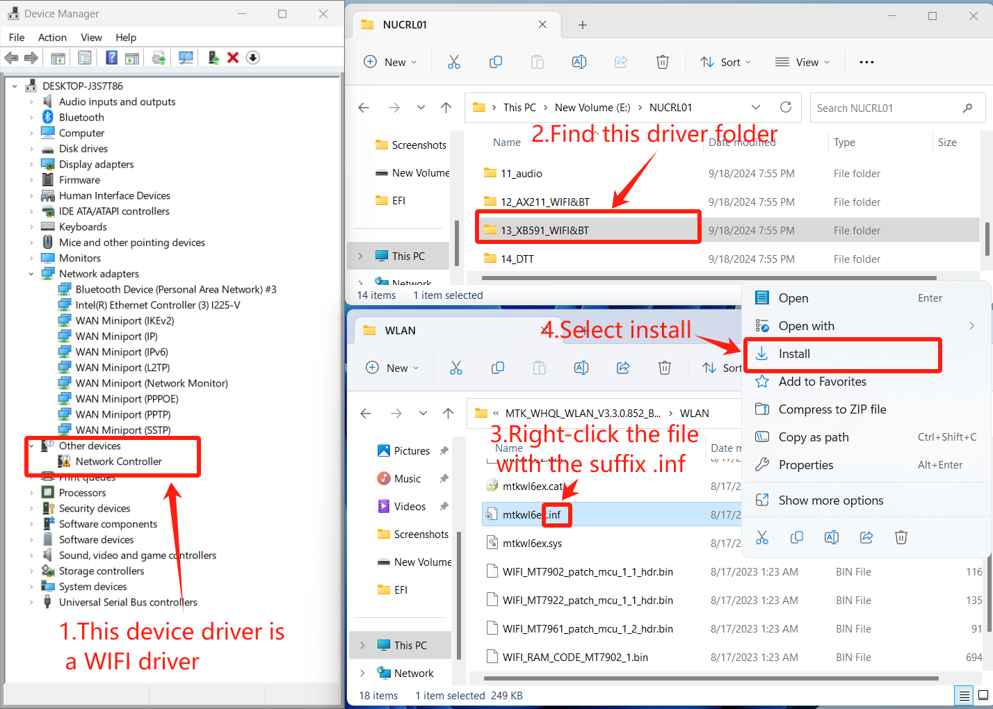- Open the downloaded driver, locate the missing driver, open its folder, and select the file with the ".inf" extension. Right-click on it, and you should see the "Install" option (on Windows 11, you may need to select "Show more options" to see this option), as shown in the image below.