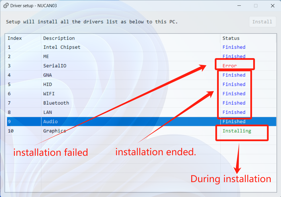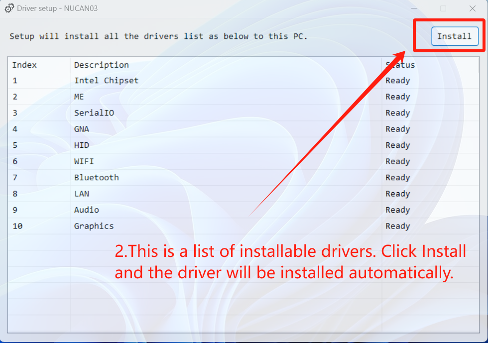 - Open the downloaded driver package, double-click the Setup.exe file to run it, and click the install button. This will install all the drivers.