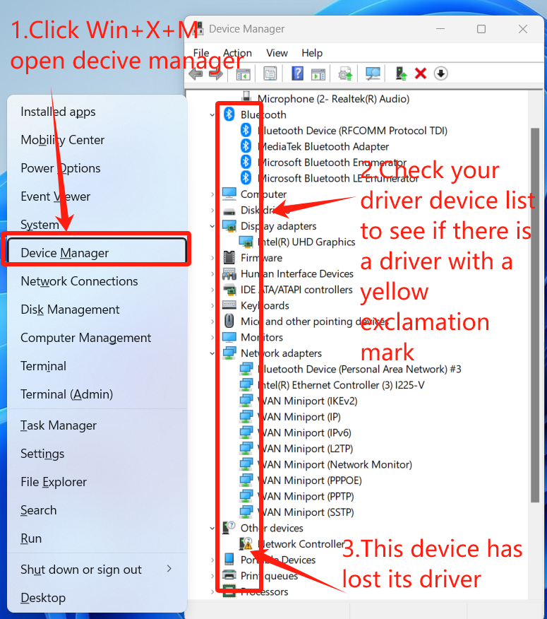 Press windows + X + M to open Device Manager. Check if there are any yellow exclamation marks in the driver list. If there are, it indicates that your computer is missing that driver and needs to be reinstalled.