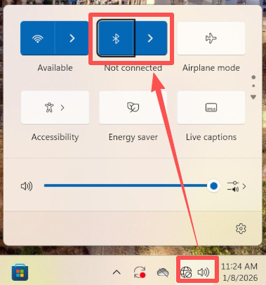 Press Win + A to open Quick Settings and ensure Bluetooth toggle is on.