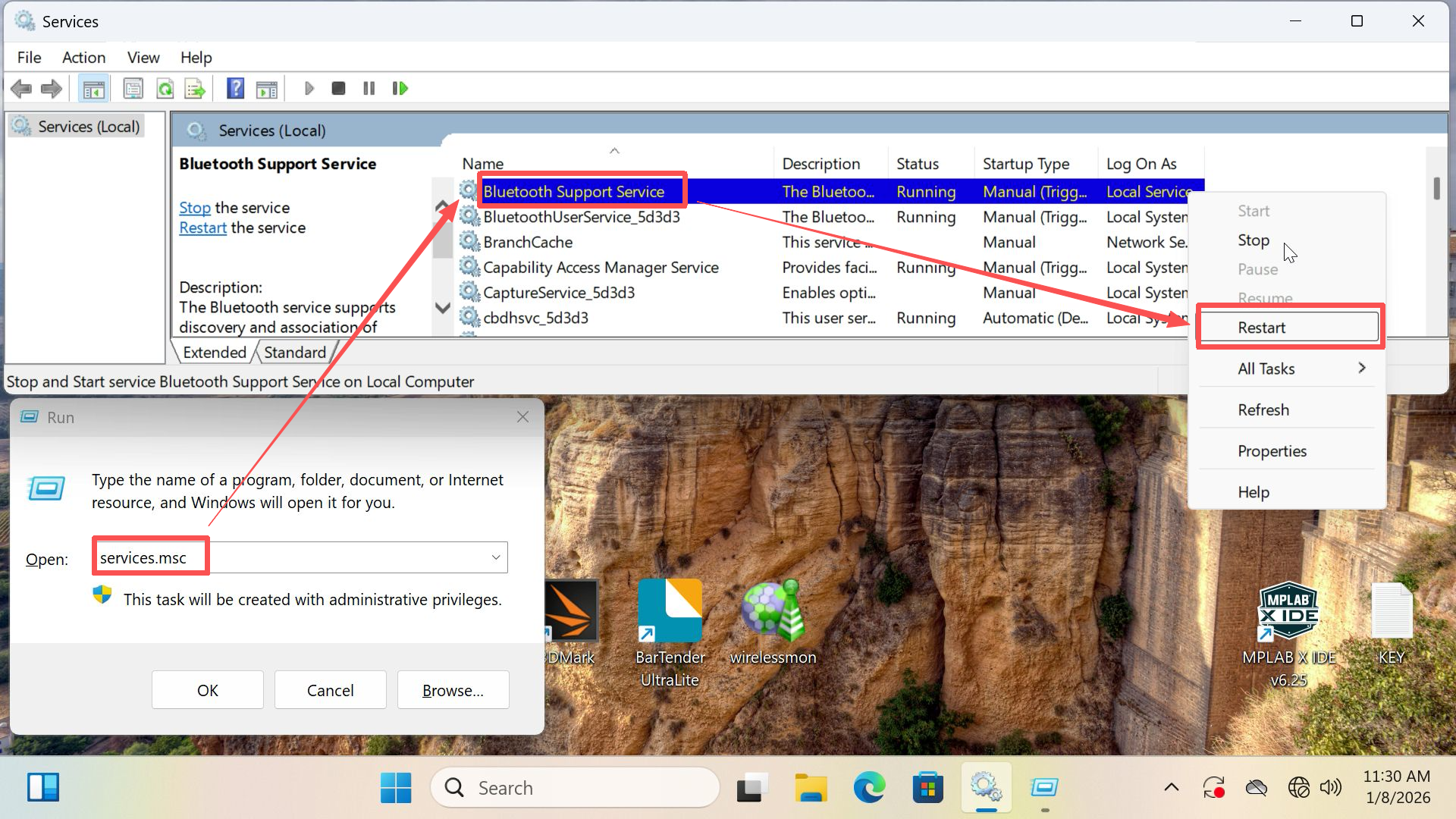 Restart Bluetooth service: Win + R → services.msc → Find Bluetooth Support Service → Restart and set to Automatic.