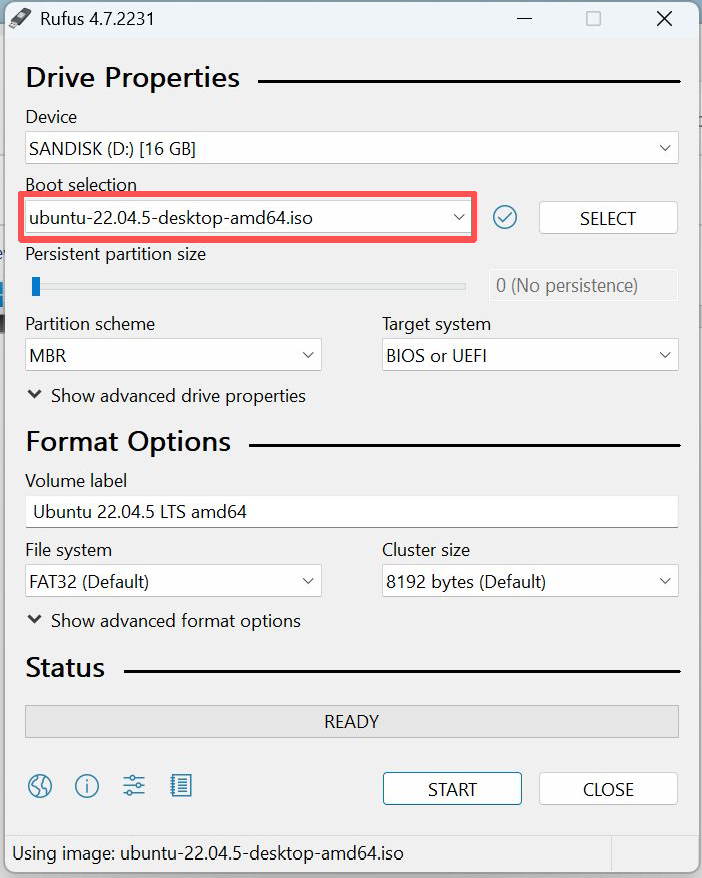- Choosing a Boot Type: Choose the ubuntu-20.04.4 image file that you downloaded.