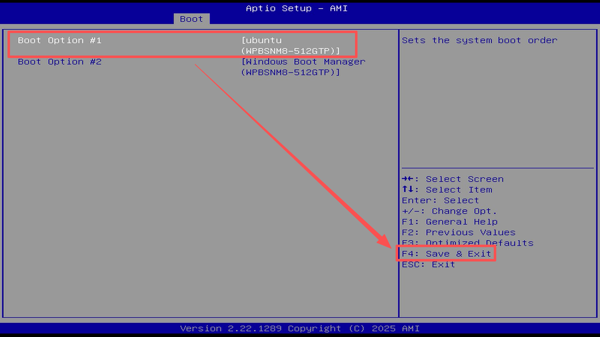 Set Boot option #1 “Ubuntu” as the first boot item