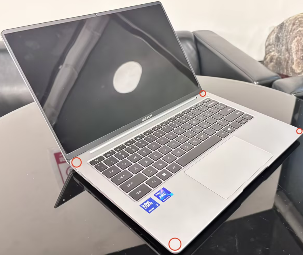 Place the laptop on a flat horizontal surface, gently press the four positions on the body with your index finger (as shown by the red circles in Figure 1) to find the footpad that is suspended off the ground. Due to the different shapes of the footpads, the footpad on one side that is off the ground is generally one of the two short footpads (as shown in Figure 2). Figure 3 shows the footpad off the ground on a defective machine.