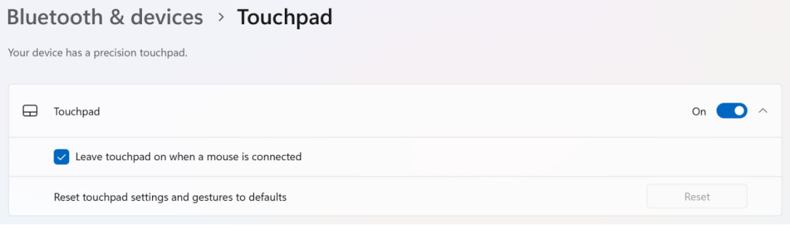 e. Restore Defaults: Expand the "Touchpad" option and click "Reset" to restore all touchpad settings to factory defaults.
