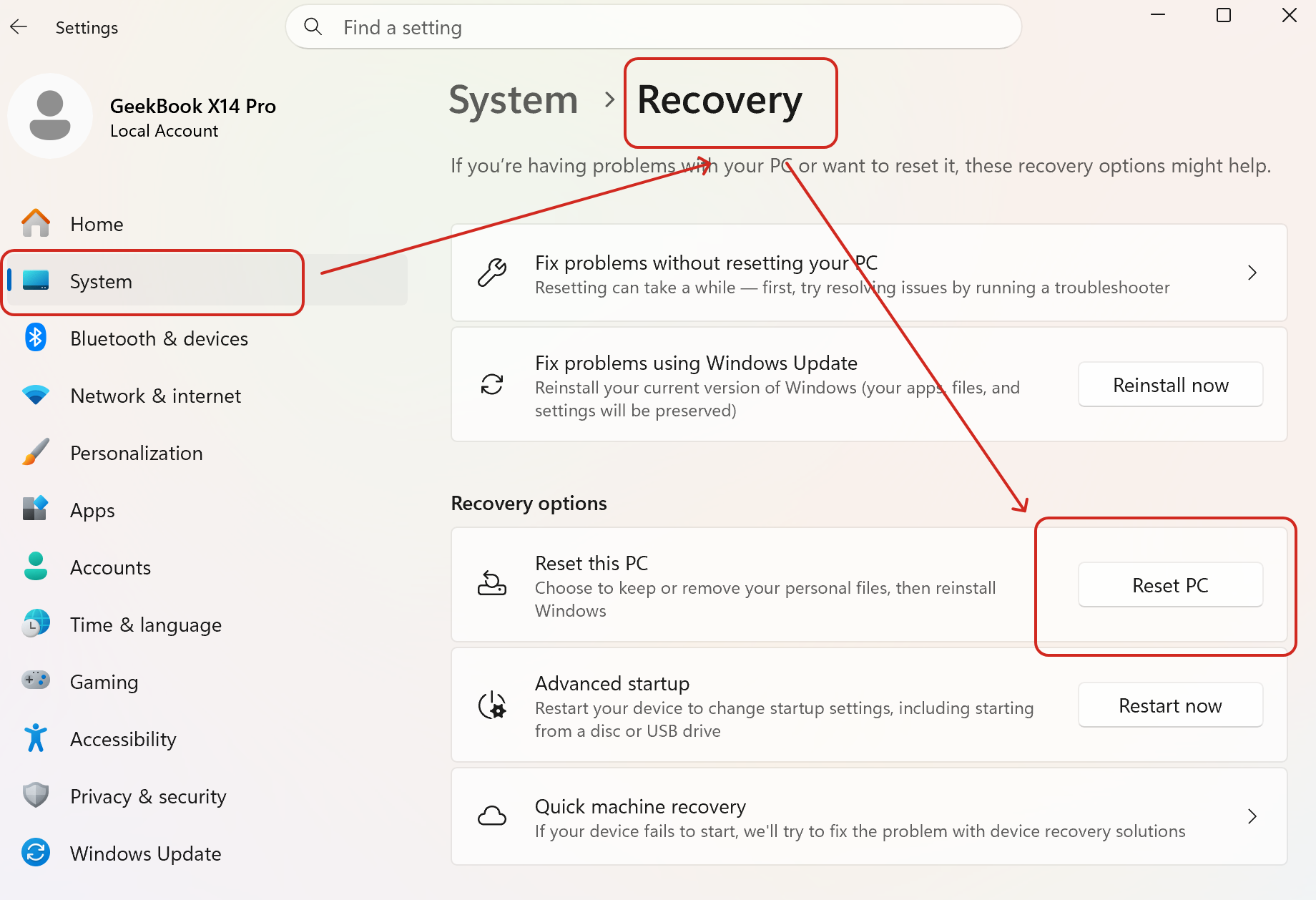 - Open Settings (Win + I) → System → Recovery, then click "Reset PC".