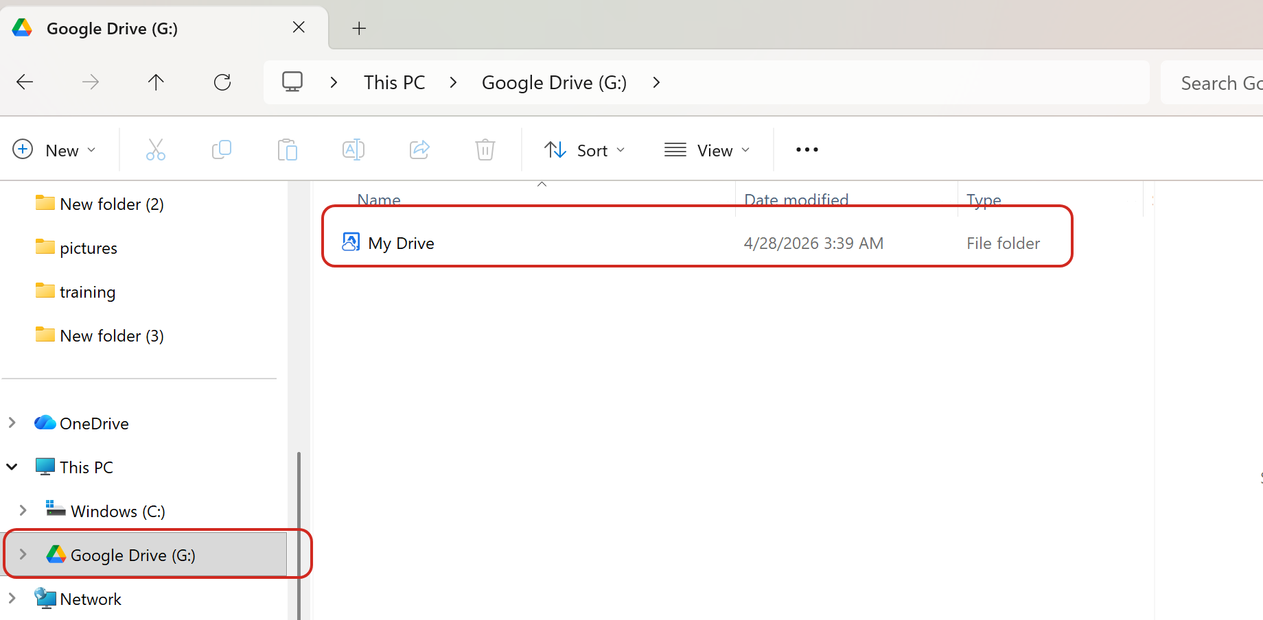 2. Enter the Google Drive disk, then drag or copy and paste files/folders (for example data.txt) onto the disk. These files will then be uploaded to Google Drive.
