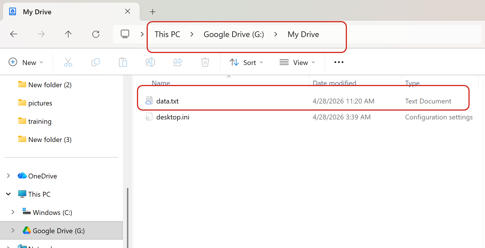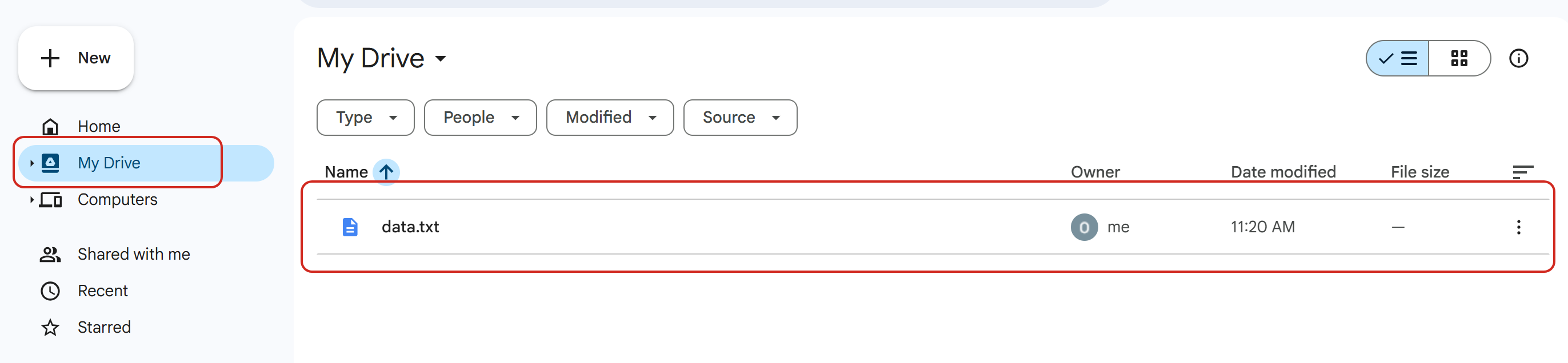 Open the Google Drive website to see that data.txt has been automatically uploaded to My Drive.