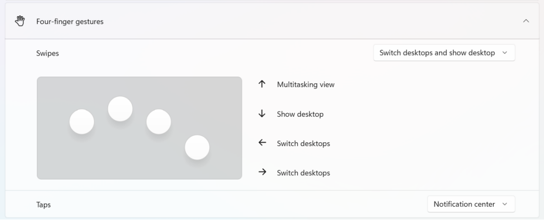 Los gestos con cuatro dedos permiten llamadas a funciones de accesos directos del sistema y cambio de escritorios. Las operaciones específicas son las siguientes: