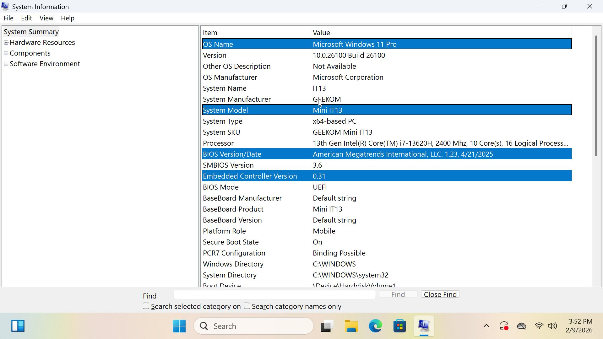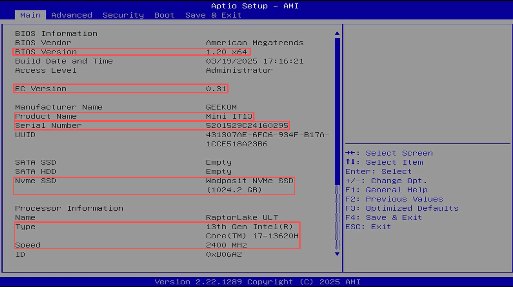 Il BIOS visualizza di default tutte le informazioni sulla configurazione hardware del dispositivo GEEKOM corrente, inclusi il modello, numero di serie (SN), modello CPU, marca e capacità della RAM e marca e capacità dell'SSD. Queste informazioni sono anche le più accurate.