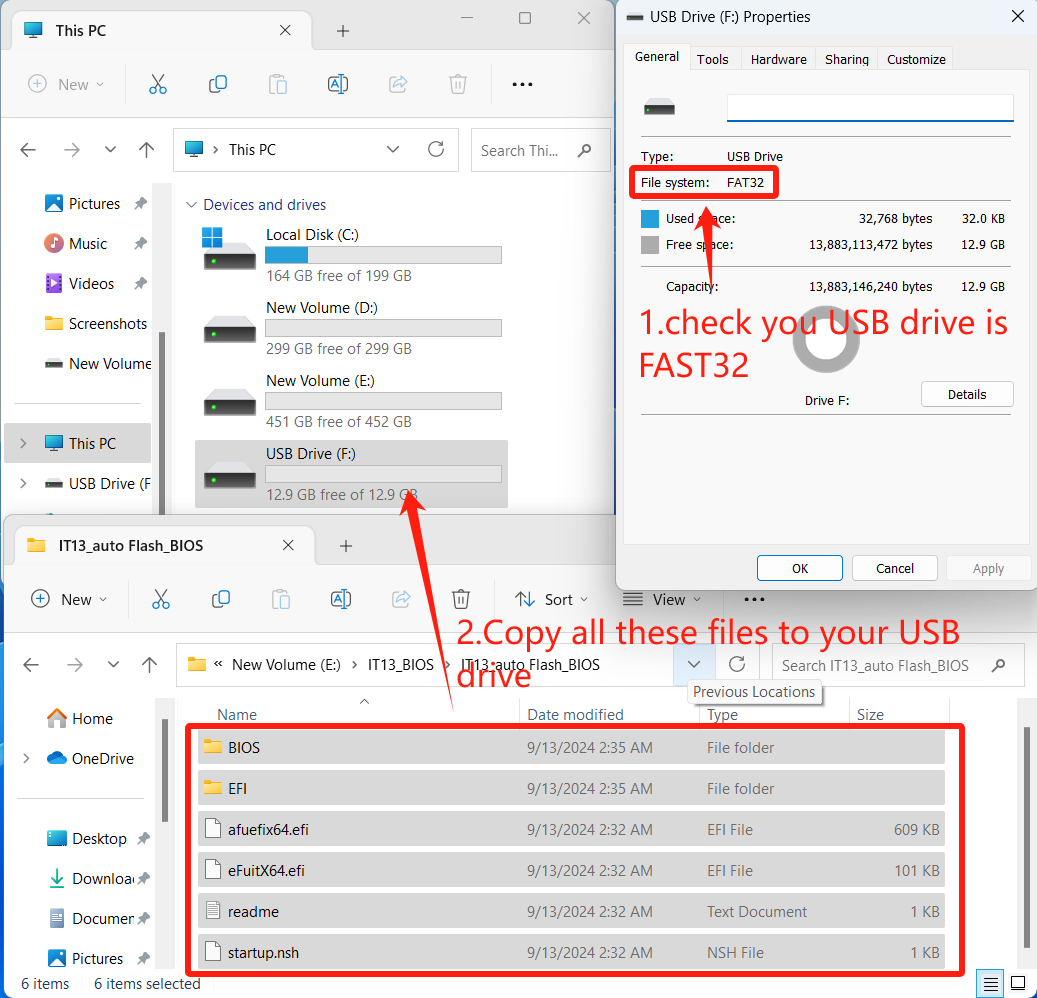 - 以下に示すように、抽出した BIOS ファイルを USB ドライブのルートディレクトリにコピーします(フォルダ全体ではなく、フォルダ内のファイルのみをコピーしてください)。