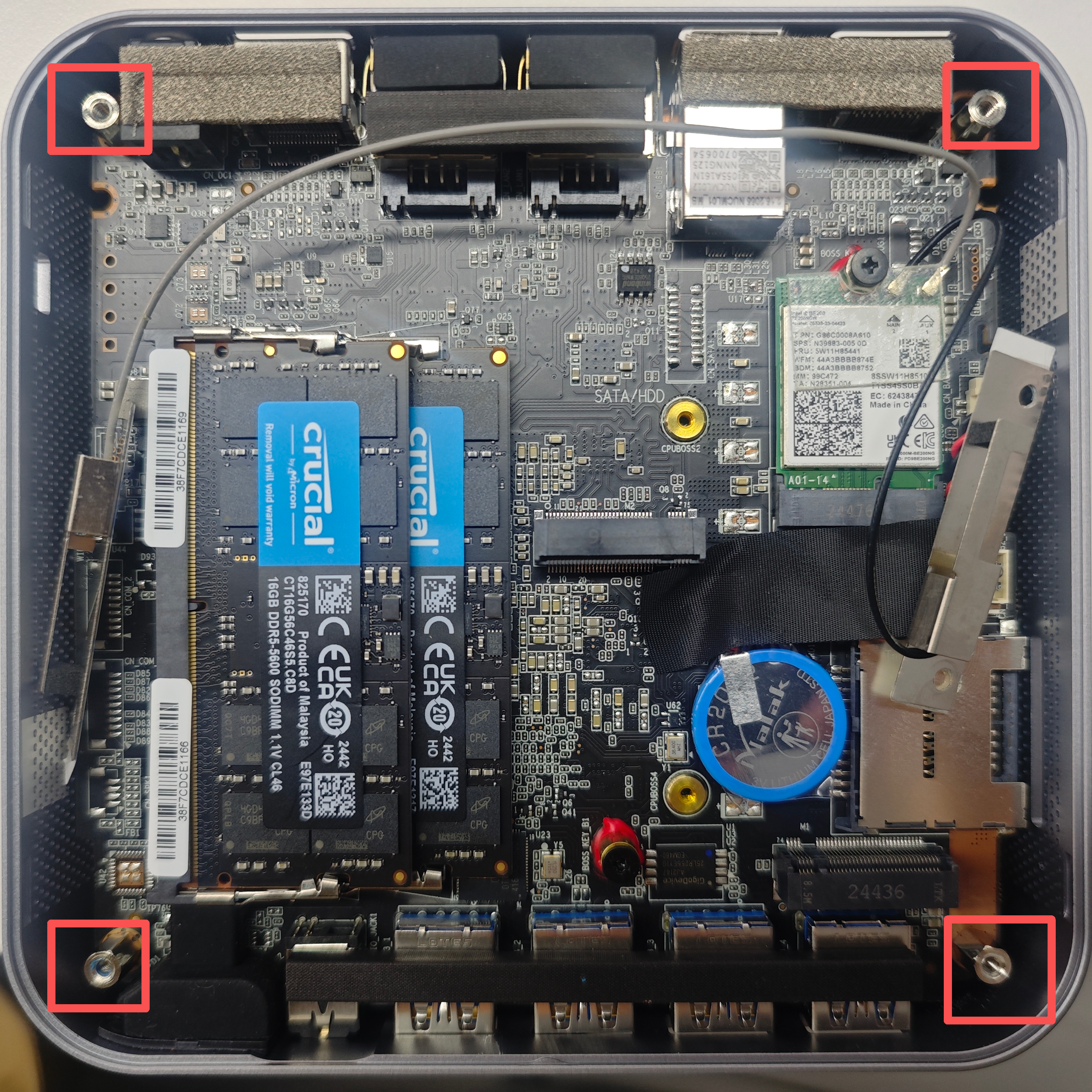 - 解決策:マザーボード固定ネジ4本を少し緩めてください。機器を垂直に置くと、冷却ファンモジュールと筐体の内壁との距離が広がり、異音は消えます。