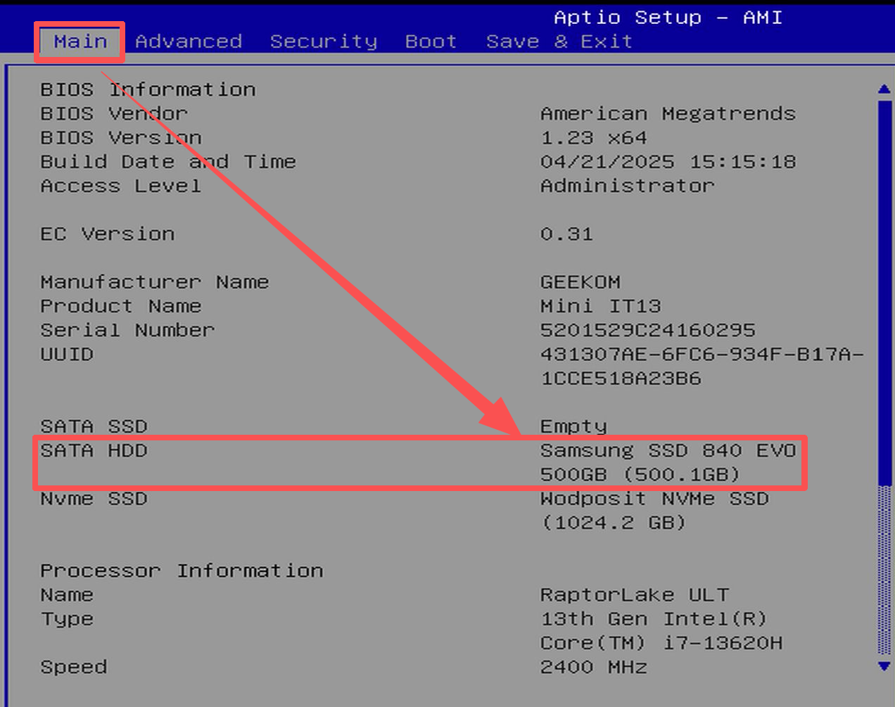 Совет: В некоторых моделях GEEKOM информация о жестком диске и памяти может отображаться на вкладке «Дополнительно» в BIOS или в разделе «Информация о системе», который необходимо выбрать и ввести для просмотра подробных сведений.