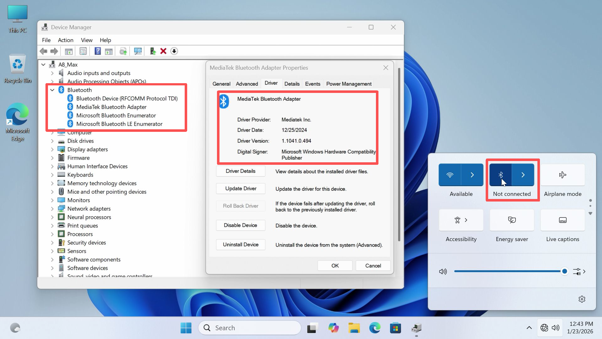 Если переключатель Bluetooth отсутствует, но драйвер Bluetooth присутствует в диспетчере устройств, это указывает на неисправность функциональности системного драйвера. Рекомендуется переустановить драйвер Bluetooth. Если проблема сохраняется, более тщательным решением будет переустановка оригинальной заводской системы, предоставленной GEEKOM. Если функция Bluetooth всё ещё отсутствует после переустановки системы, неисправность можно окончательно подтвердить как аппаратную. В таком случае вы можете обратиться в службу поддержки GEEKOM для дальнейшего решения.